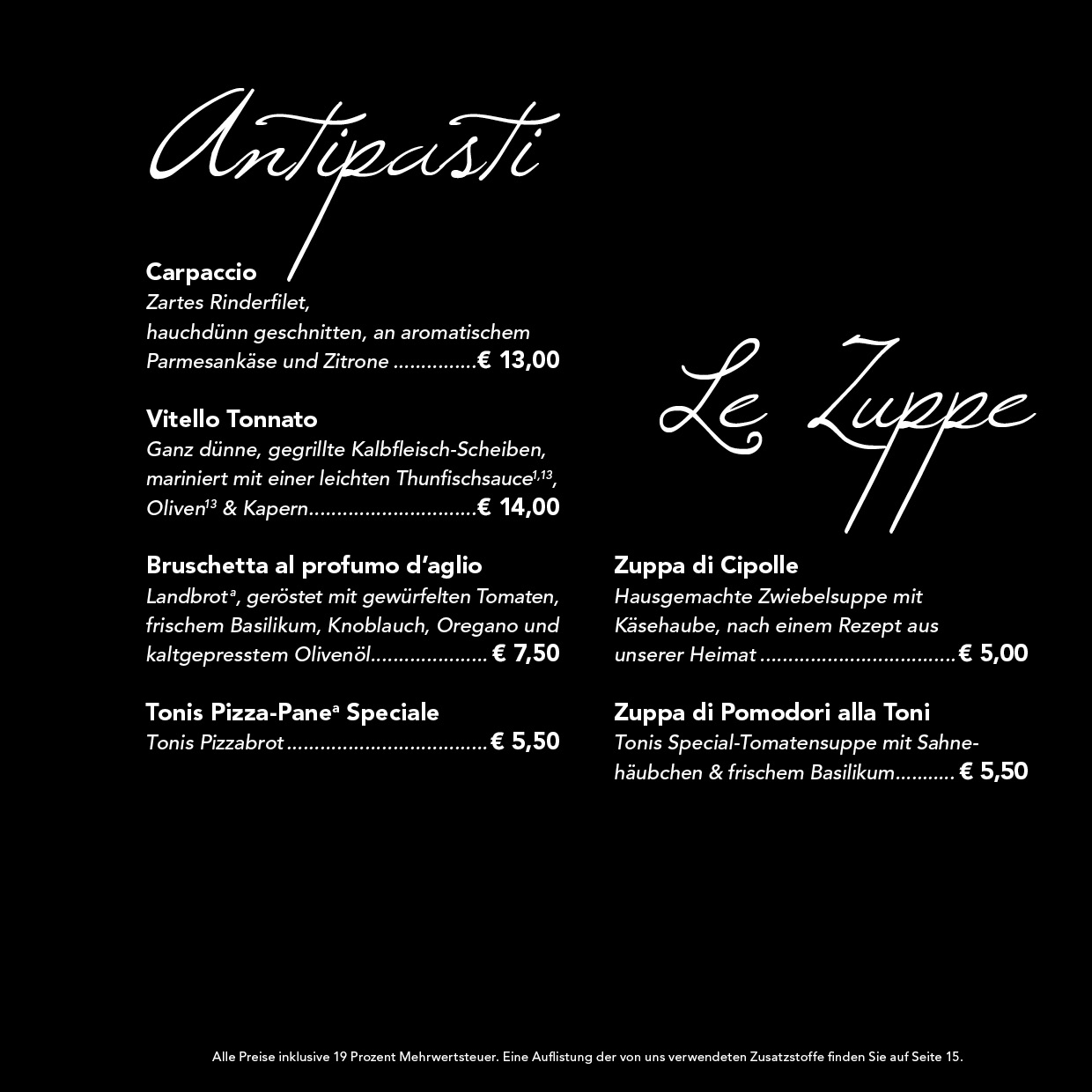 Wir, die Familien von Toni De Flaviis und Lazaros Dimitriou heissen Sie in unserem Restaurant für italienische Spezialitäten herzlich Willkommen. Wir präsentieren Ihnen eine umfangreiche Speisekarte, und Toni hält in seiner Küche permanent eine besondere Überraschung vor - fragen Sie nach unserer Empfehlung!