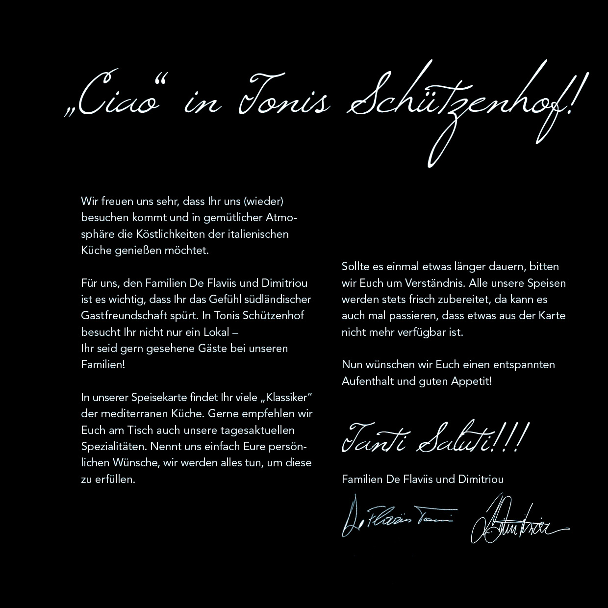 Wir, die Familien von Toni De Flaviis und Lazaros Dimitriou heissen Sie in unserem Restaurant für italienische Spezialitäten herzlich Willkommen. Wir präsentieren Ihnen eine umfangreiche Speisekarte, und Toni hält in seiner Küche permanent eine besondere Überraschung vor - fragen Sie nach unserer Empfehlung!